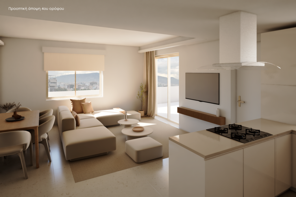 4ος όροφος, Αποτελείται από 1 οροφοδιαμέρισμα με 2 υπνοδωμάτια, 1 μπάνιο, και καθιστικό ενιαίας διαρρύθμισης με κουζίνα. Είναι γωνιακό, διαμπερές και ενεργειακής κλάσης Α. Διαθέτει μεγάλες βεράντες, ενεργειακά κουφώματα αλουμινίου Europa θερμοδιακοπτόμενα βάσει Η/Μ μελέτης με ηλεκτρικά ρολά και σίτες, πόρτα ασφαλείας διπλής θωράκισης, σύγχρονο σύστημα θυροτηλεόρασης, προεγκατάσταση συναγερμού, αντλία ψύξης, θέρμανσης Fan Coil, αποθήκη και πάρκινγκ πυλωτής συνολικής επιφάνειας 22 τ.μ.