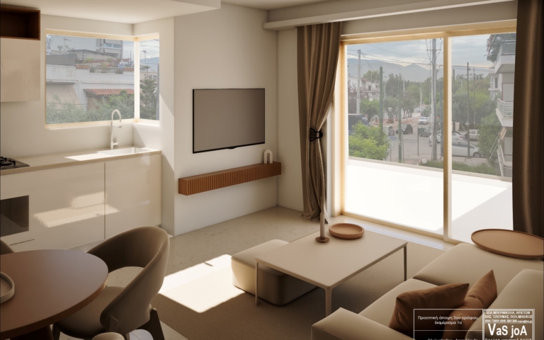Αποτελείται από 2 υπνοδωμάτια, 1 μπάνιο, 1 W.C. και καθιστικό ενιαίας διαρρύθμισης με κουζίνα. Είναι γωνιακό, διαμπερές και ενεργειακής κλάσης Α. Διαθέτει μεγάλες βεράντες, ενεργειακά κουφώματα αλουμινίου Europa θερμοδιακοπτόμενα βάσει Η/Μ μελέτης με ηλεκτρικά ρολά και σίτες, πόρτα ασφαλείας διπλής θωράκισης, σύγχρονο σύστημα θυροτηλεόρασης, προεγκατάσταση συναγερμού, αντλία ψύξης, θέρμανσης Fan Coil, αποθήκη και πάρκινγκ πυλωτής συνολικής επιφάνειας 22 τ.μ.